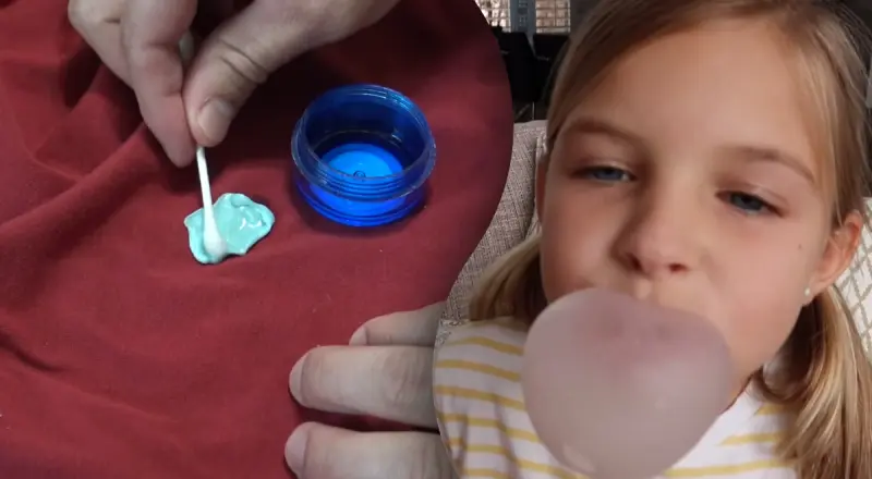 Нанесите средство на пятно и дайте ему размягчить остатки. Осторожно удалите жевательную резинку с ткани, но старайтесь не растягивать ткань.