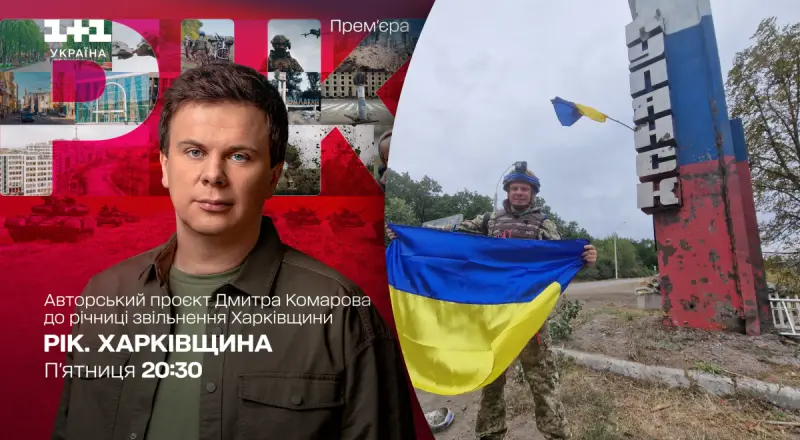 29 сентября в 20:30 на телеканале 1+1 Украина состоится премьера авторского документального проекта Дмитрия Комарова "Год. Харьковщина", который будет состоять из пяти фильмов. Новая документальная работа журналиста посвящена годовщине деоккупации Харьковской области и Слобожанского контрнаступления. Отступление россиян, которое Минобороны рф назвало "перегруппировкой", было стремительным и хаотичным. Как ВСУ провели эту показательную контратаку и что в этом помогло? Впервые раскрываются ранее неизвестные детали событий того времени, о которых уже можно говорить.