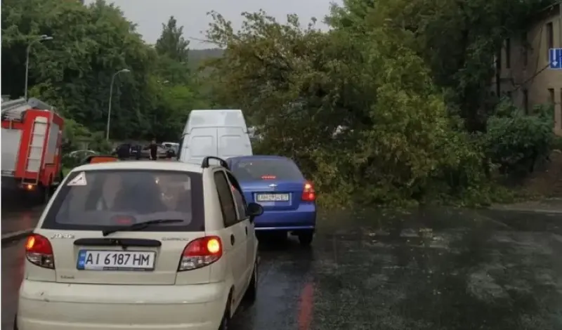 Огромное дерево упало прямо на проезжую часть, перегородило движение и раздавило легковую машину.