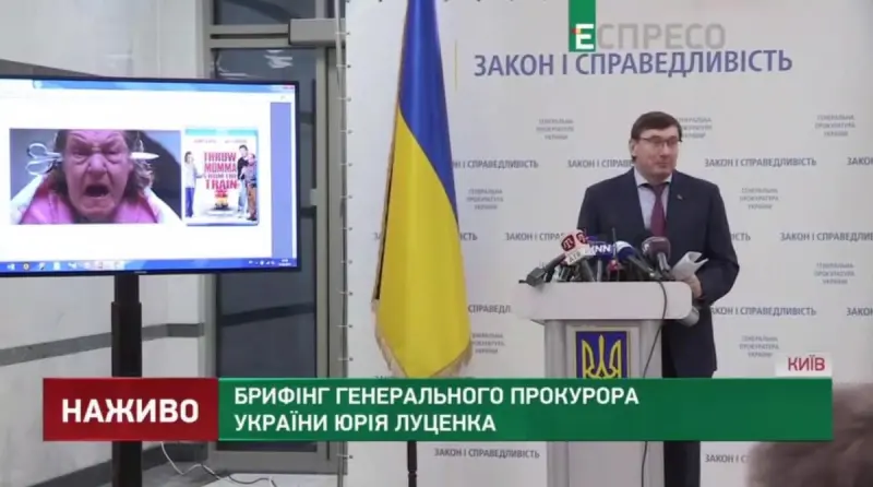 Во время брифинга Луценко показал слайд с кадром из фильма "Сбрось маму с поезда", заявив, что он напоминает ей лидера партии Баткьвищина.