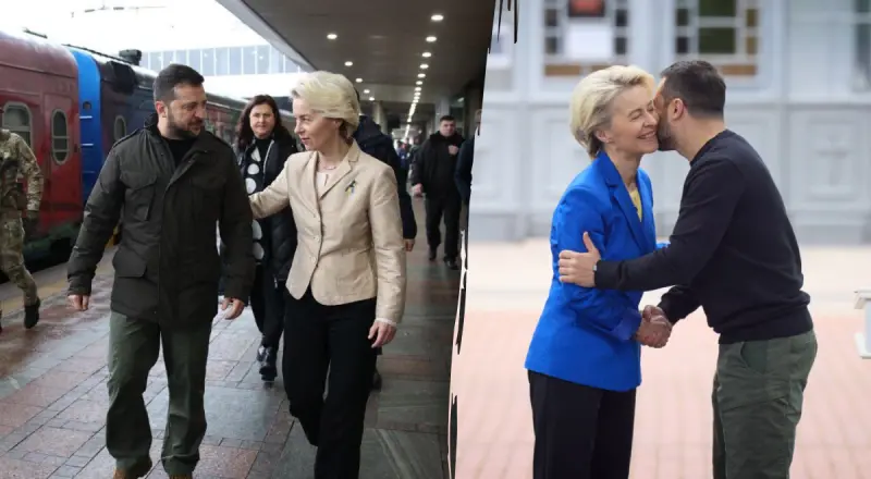 Позже появилось фото главы Еврокомиссии на вокзале в Киеве. Урсулу фон дер Ляйен встретил президент Украины Владимир Зеленский.