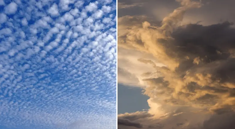 2. Перисто-кучевые облака: тонкие облака, похожие на небольшие «хлопковые пятна».