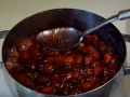Когда в емкости из сока и сахара образуется сироп, аккуратно все перемешайте. Потом отделите ягоды с помощью шумовки от сока. Поставьте кастрюлю с соком на средний огонь и, помешивая, доведите жидкость до кипения. Когда сахар полностью растворится, сделайте маленький огонь и уварите сироп на 1/4 часть (около 20 минут).