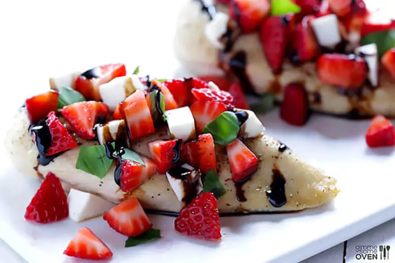 Тим часом, доведіть половину чашки оцту до кипіння в маленькій каструлі на середньому вогні. Зменшіть вогонь до середнього і варіть близько 10 хвилин. У невеликій мисці змішайте полуницю, моцарелу і базилік, нарізані кубиками, щоб приготувати начинку. Коли курка буде готова, перейдіть до подачі страви. Викладіть курячу грудку, а на неї зверху полуничне капрезе.