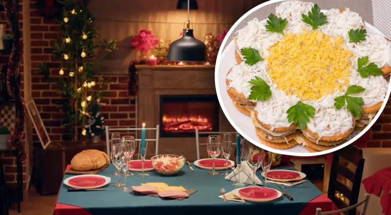 Такой закусочный торт-салат стоит приготовить на Новый год 2024, чтобы задобрить покровителя года - Дракона.