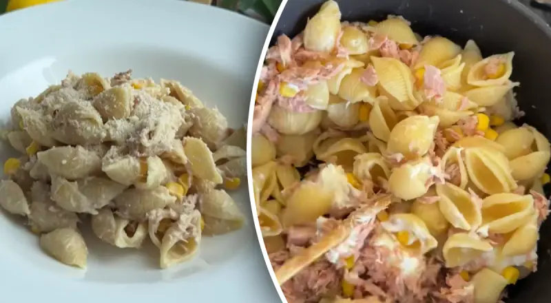Для быстрого ужина нужно для начала сварить макароны в подсоленной воде. Когда они будут готовы, добавляем ложку сливочного сыра, банку тунца в собственном соку и кукурузу по вкусу.