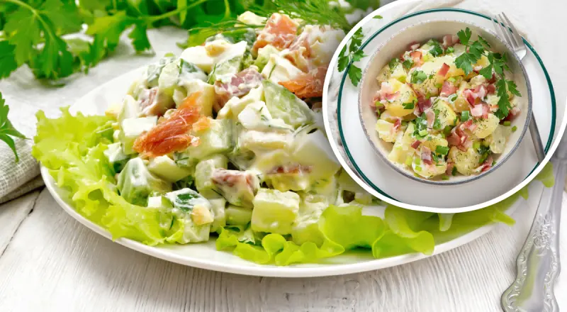 Хорошо перемешать салат, но аккуратно, чтобы картошка не развалилась.