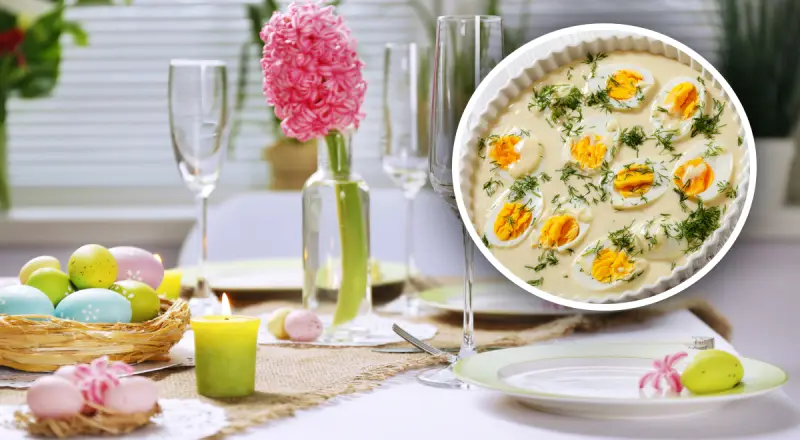 Подаем заливные яйца на Пасху в соусе тар-тар охлажденными.