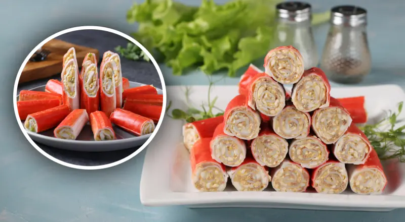 Крабовые палочки развернуть, добавить немного начинки и быстро завернуть.