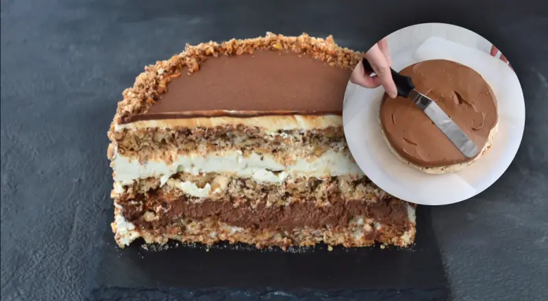 13. Обмажьте боковые стенки и верхнюю часть торта шоколадным масляным кремом. Равномерно разровняйте верхнюю поверхность торта влажной лопаточкой. Обсыпьте боковые стенки крошкой из орехов или крошкой от коржей.