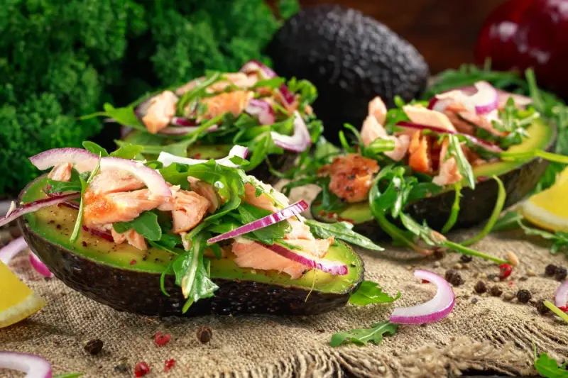 Переложить все в лодочки из кожуры авокадо и подавать охлажденными к столу.