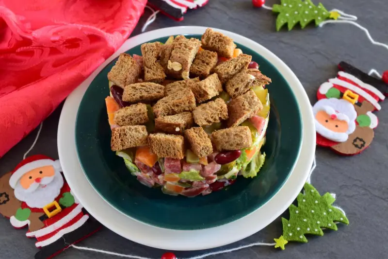 Подавать салат с курицей на Новый год 2023 с гренками из черного хлеба.