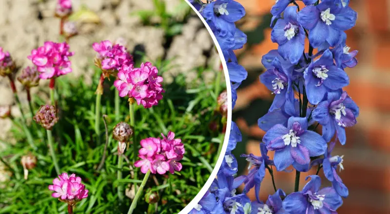 Армерия. Это компактное многолетнее растение, которое растет низкими кустами и имеет длинные стебли, поддерживающие шары ярко-розовых цветов.