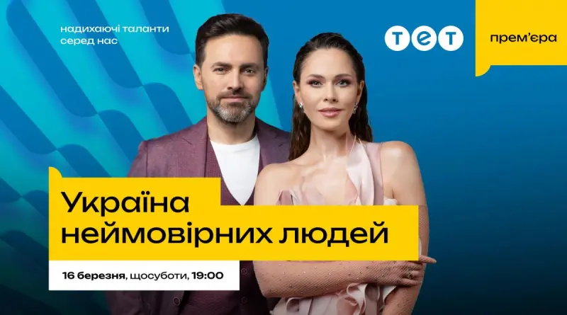 Уже 16 марта телеканал ТЕТ покажет уникальное и сверхсовременное шоу "Україна неймовірних людей", которое влюбит зрителей в разнообразие несравненных талантов. Это проект-вдохновение, который каждую субботу в 19:00 будет объединять страну вокруг несокрушимых, сильных, смелых и в то же время чрезвычайно талантливых людей. Тех, кто озаряет путь и дарит надежду.