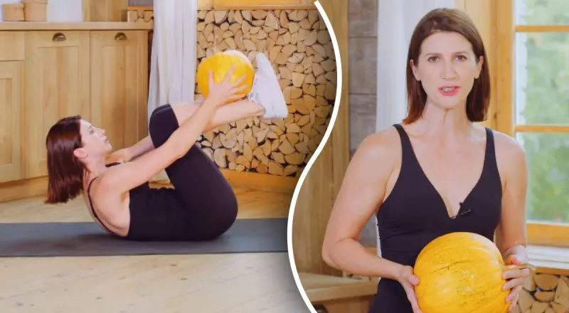 Эта зарядка дает хороший эффект, потому что она выполняется с дополнительной нагрузкой. Нужно будет взять какой-то предмет, который весит несколько килограммов. Это может быть гантель – с ней выполнять упражнения будет удобнее всего. Но при этом можно использовать и подручные предметы, которые есть у вас дома. Например, тренер использовала в качестве дополнительной нагрузки тыкву весом 5 килограммов.