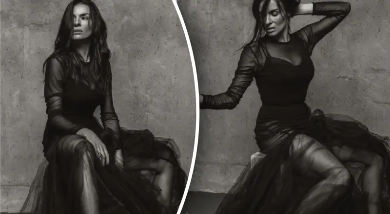 Мейхер хвастается своей растяжкой в черном наряде на черно-белых фото.