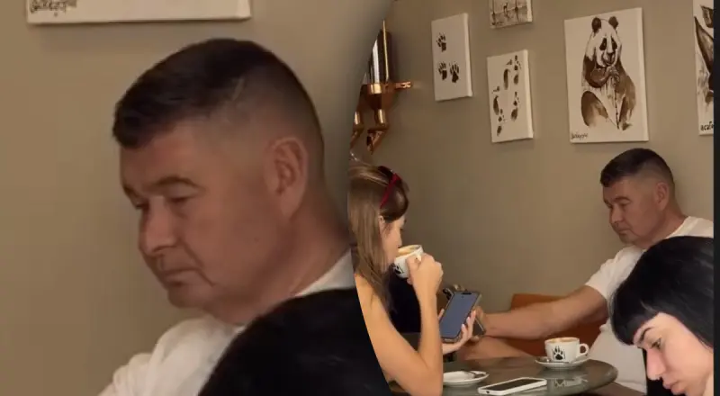 Он сидел за столиком с пресным выражением лица, пока его спутница сидела в своем смартфоне.