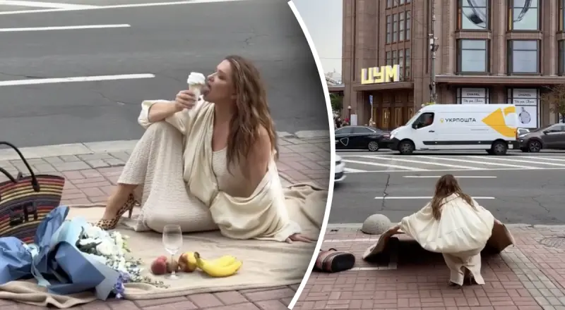 Украинская известная певица Наталья Могилевская легла на асфальт напротив столичного ЦУМа и устроила там импровизированный пикник.