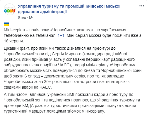 "Создатели мини-сериала "Чернобыль" обсуждают возможность вернуться к Киев и Чернобыльскую зону, чтобы снять 6 эпизод", - говорится в сообщении.