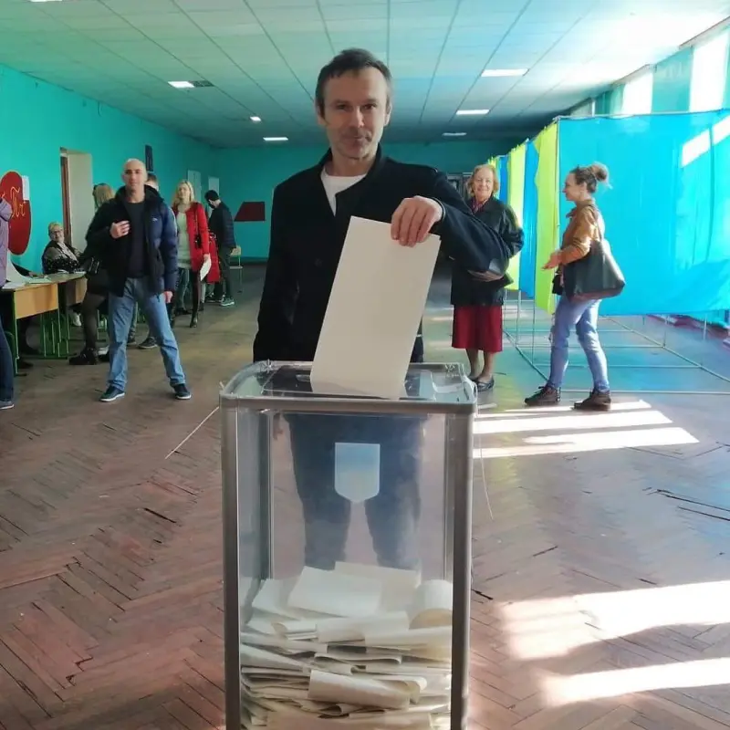 Лидер группы Океан Эльзы Святослав Вакарчук проголосовал на выборах президента Украины 2019. Знаменитость пришел на избирательный участок уже после 15.00 в одноименной с его флешмобом футболке "#ГолосуюНепоПриколу".