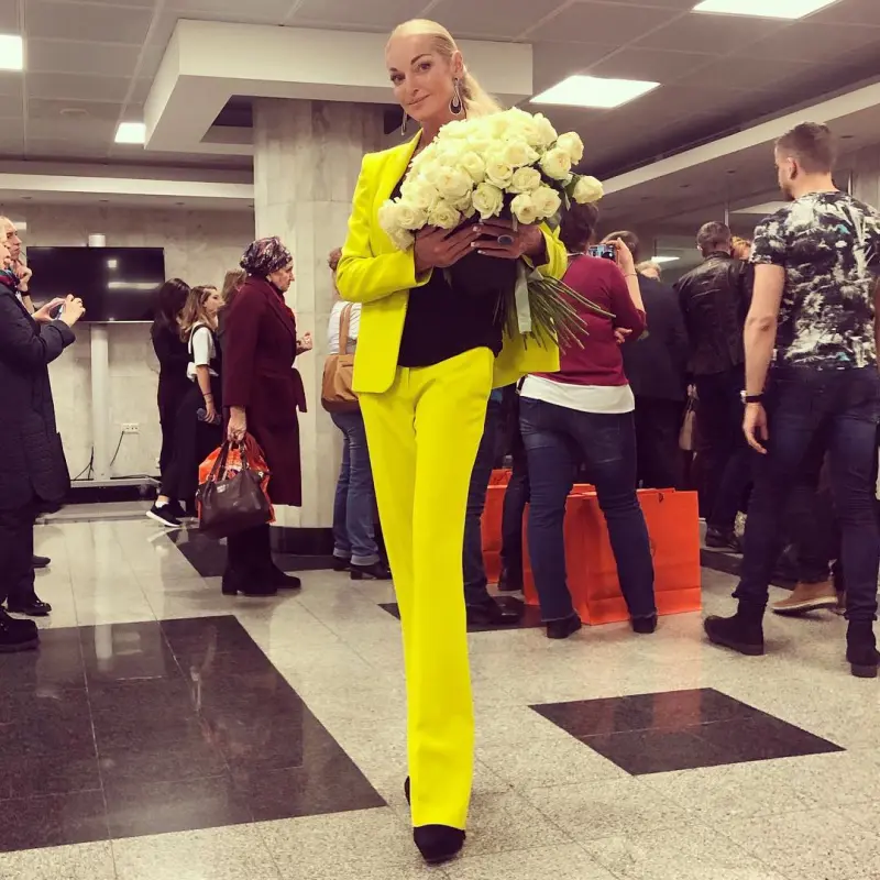 Во время исполнения новой песни Счастье напоказ, к Пугачевой на сцену неожиданно поднялась скандальная российская балерина Анастасия Волочкова, и в кислотно-желтом брючном костюме дважды села на шпагат. Видео с вечера на своей странице в Instagram поделилась сама балерина.