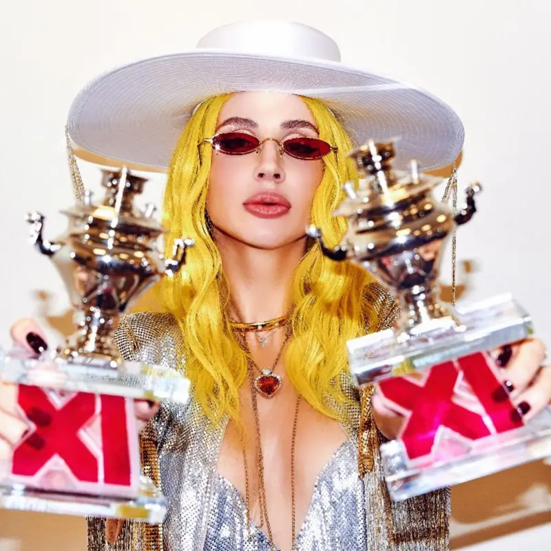 Артистка на своей странице в Instagram показала откровенные фото, на которых она держит две награды, позируя в серебристом мини-платье с глубоким декольте и желтыми волосами.