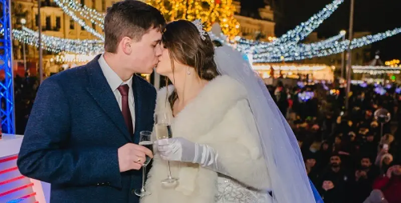Двадцатилетний жених и 17-летняя невеста стали мужем и женой на глазах у миллионов украинцев, ведь пара обручилась в прямом эфире ТСН прямо на Софийской площади в центре Киева.