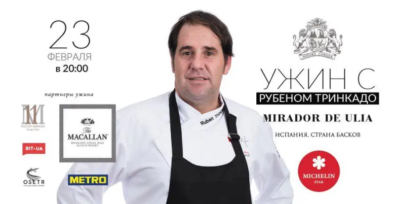 По этому случаю из гастрономической Мекки - города Сан-Себастьян - в Киев прибудет шеф-повар Рубен Тринкадо. Родной город шефа внесен в книгу рекордов Гиннеса по количеству мишленовских звезд на квадратный метр. Одной из них отмечен ресторан Mirador de Ulía, в котором маэстро Рубен Тринкадо представляет третье поколение своей семьи. Его талант был отмечен выдающимся шеф-поваром Испании, обладателем 7 звезд Мишлен - Мартином Берасатеги.