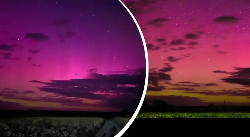 Северное сияние пурпурного цвета, которое редко можно увидеть за пределами полярных широт, на этот раз видели в Киеве, Львове, Черновцах, Запорожье, Днепре и на Волыни.