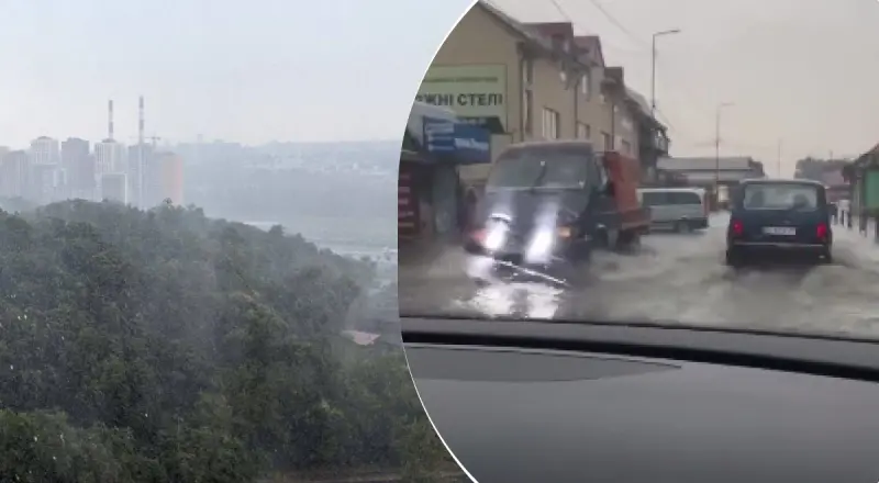 Известно, что непогода накрыла Львовскую и Киевскую области. Мощный грозовой ливень заливает даже столицу. Внезапный дождь превратил дороги в настоящие реки, а машины вынуждены "плавать".