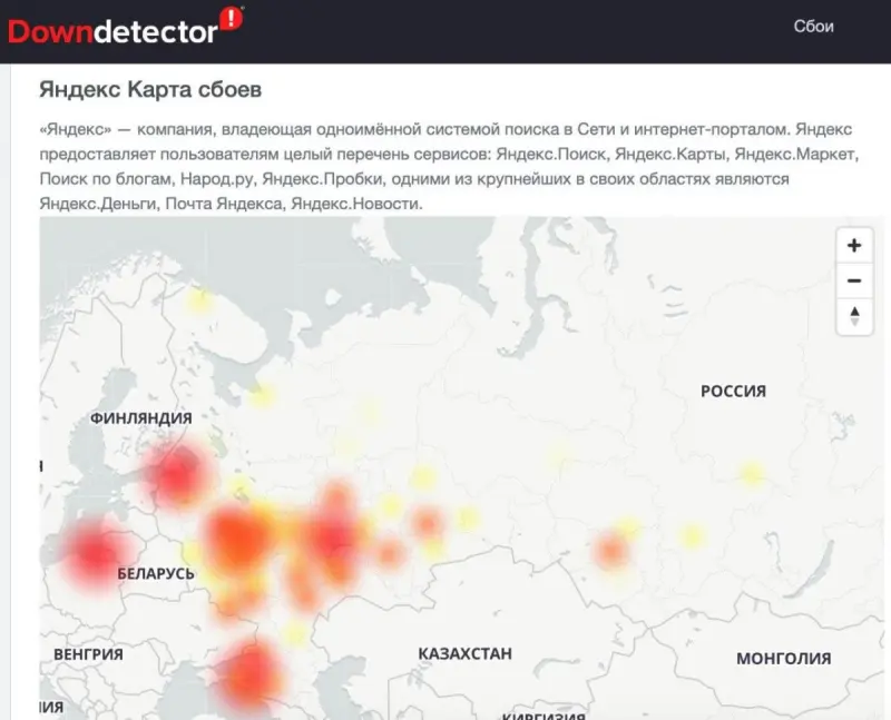 На то, что Яндекс не работает, жалуются жители Москвы, Санкт-Петербурга, Казани, Нижнего Новогорода, Перми, Самары, Екатеринбуга, Уфы и других городов.