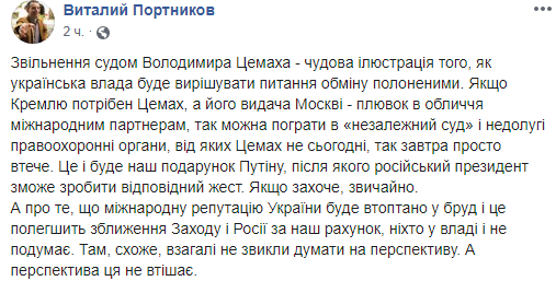 "Освобождение судом Владимира Цемах - прекрасная иллюстрация того, как украинская власть будет решать вопрос обмена пленными. Если Кремлю нужен Цемах, а его выдача Москве - плевок в лицо международным партнерам, так можно поиграть в "независимый суд" и нелепые правоохранительные органы, от которых Цемах не сегодня, так завтра просто убежит. Это и будет наш подарок Путину, после которого российский президент сможет сделать соответствующий жест. Если захочет, конечно", - отметил Портников.
