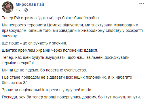 "Мы не просто террориста Цемаха отпустили, мы пренебрегли международным правосудием, более того, мы помешали международном следствию в раскрытии преступления. Еще хуже - это соучастие в преступлении. Шантаж Кремлем Украины через пленных удался. Теперь, нас еще и будут заставлять, чтобы наши освобождены досиживали сроки в Украине. Мы на это не пойдем, потому что восстанет общество. И это станет предлогом не отдавать всех остальных пленных, а их гораздо больше, чем 35. Предали национальные интересы в угоду рейтингов. Господи, хоть бы теперь ребята вернулись домой, а то и здесь могут кинуть", - написал Гай.