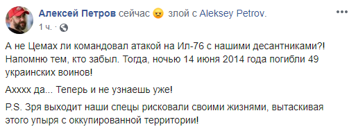 "А не Цемах ли командовал атакой на Ил-76 с нашими десантниками?! Напомню тем, кто забыл. Тогда, ночью 14 июня 2014 года погибли 49 украинских воинов! Ахххх да... Теперь и не узнаешь уже! P.S. Зря выходит наши спецы рисковали своими жизнями, вытаскивая этого упыря с оккупированной территории!", - написал Петров.