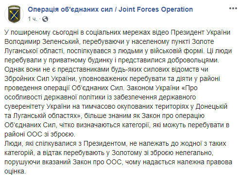 "В распространенном сегодня в социальных сетях видео президент Украины Владимир Зеленский, находясь в населенном пункте Золотое Луганской области, пообщался с людьми в военной форме. Эти люди находились в частном доме и представились добровольцами. Однако они не являются представителями каких-либо силовых ведомств или Вооруженных Сил Украины, уполномоченных находиться и действовать в районе проведения операции Объединенных Сил", - сказано в сообщении.