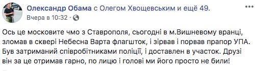 "Вот это московитское чмо из Ставрополя сегодня в Вишневом утром сломало в сквере Небесная Варта флагшток, сорвал и порвал флаг УПА. Был задержан сотрудниками полиции, и доставлен в участок. Друзья он за это получил хорошо, по лицу и голове мы его просто не били!", - написал Олександр Обама в Facebook.