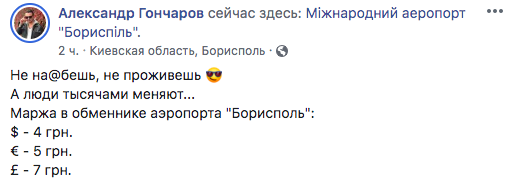 "Не на@бешь, не проживешь. А люди тысячами меняют... Маржа в обменнике аэропорта Борисполь: $ - 4 грн. € - 5 грн. £ - 7 грн", - написал Гончаров.