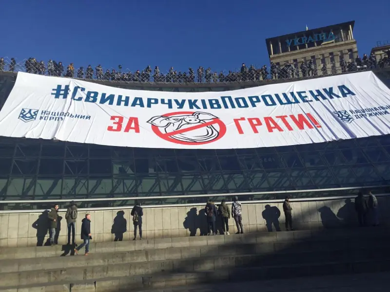 Участники акции разместили за стелой Незалежности баннер с призывом посадить в тюрьму Порошенко, а также замсекретаря СНБО Олега Гладковского и его сына Игоря (несколько лет назад носили фамилию Свинарчуки) из-за расследования о хищениях в "оборонке".