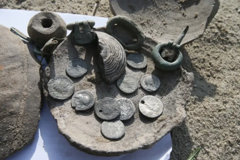 "Найденные римские монеты — денарии первых столетий нашей эры. Они находились на глубине 30 сантиметров — ниже этого уровня современный бетон! А культурные наслоения в этом месте начинаются с глубины полтора метра", — отметил собеседник.