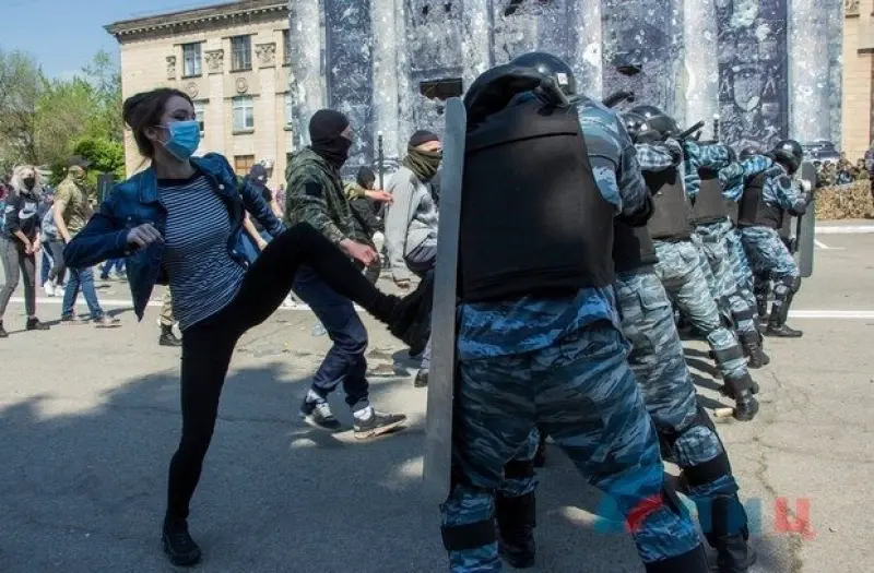 "В Луганске здание университета превратили в фальшивый Рейхстаг и имитировали его штурм. А потом на фоне этого Рейхстага имитировали битву Беркута с активистами Майдана. Причем больше всего это напоминало не Майдан, а события весны 2014, когда по Луганску эти же самые типочки в масках и бегали, и били сотрудников МВД со щитами", - написал в Facebook журналист Денис Казанский.