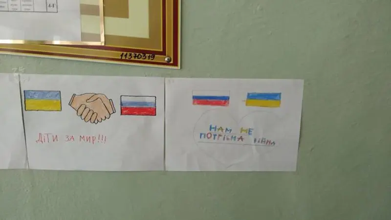 "Мы за мир", "Дети за мир", "Нам не нужна война", - такие тексты написали на рисунках дети.
