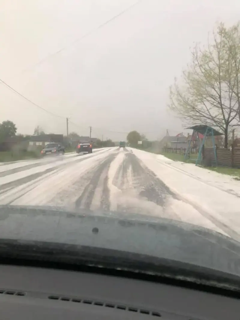 Пользователь также опубликовал фотографии, на которых видно, что град покрыл дорогу.