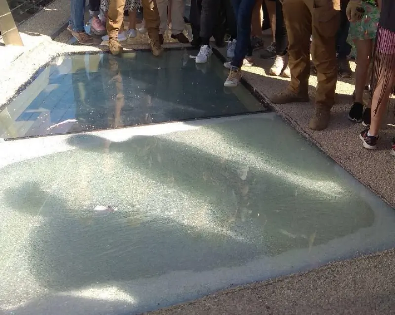 Посетителям временно вход на объект запрещен. Один из полицейских, охраняющих вход на мост, сказал, что стекло треснуло после того, как на нем попрыгала группа неизвестных.