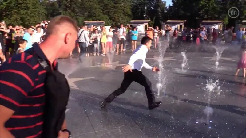 Зеленский спасся от толпы единственным свободным на тот момент путем – через фонтан. Он побежал под потоки воды, а за ним устремилась и охрана.