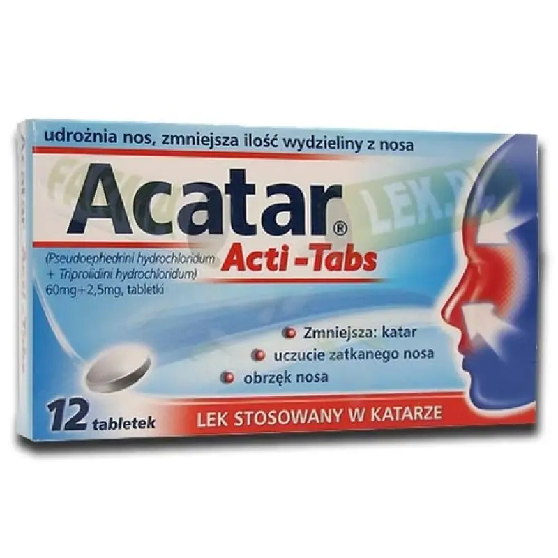 Отметим, полное название медицинского препарата - Acatar acti-tabs (Pseudoephedrini hydrochloridum + Triprolidini hydrochloridum) (60 mg + 2.5 mg) tabletki. Производитель - US Pharmacia Sp. Z o.ах., Вроцлав, Польша.