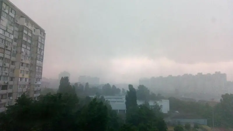 Были видны молнии и слышны мощные раскаты грома. Позже дождь утих. Возле Контрактовой площади небо тоже затянули тучи и был дождь.