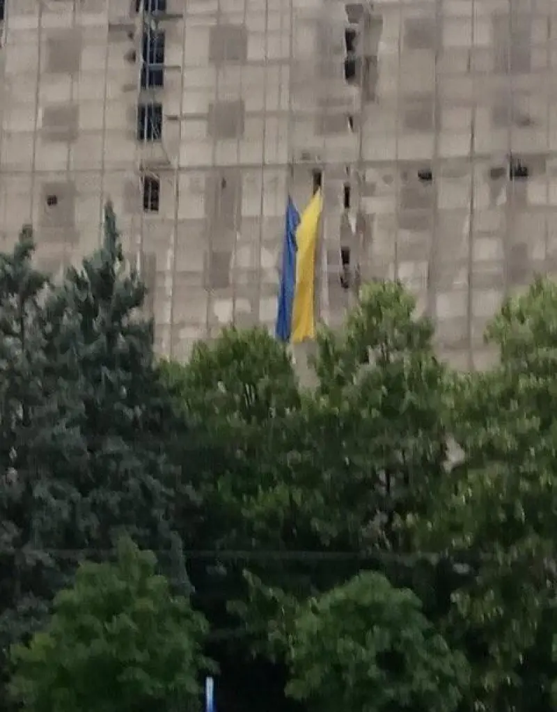 Стяг вывесили на опустевшем здании бывшей гостиницы Украина, передает сайт 62.ua.