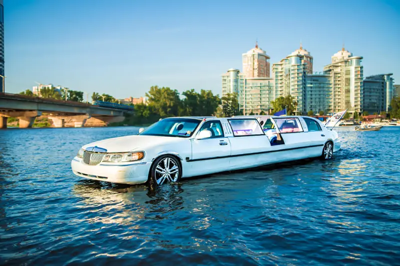 В Киеве жители заметили необычное плавсредство, которое курсирует по Днепру – белый речной лимузин с крутящимися колесами и пассажирами на борту.