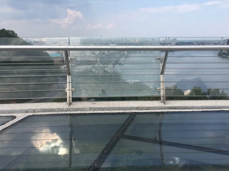29 июля очевидцы обнаружили, что боковое стекло сразу за перилами раскрошилось. Треснула всего одна секция, территория вокруг стекла огорожена, передает Информатор.