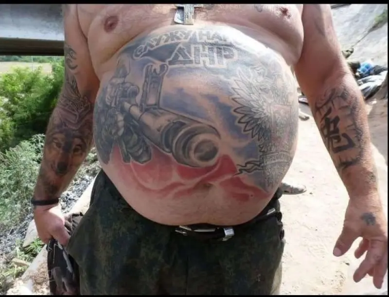 Примечательно, что крупногабаритный мужчина набил тату с надписью «Служу народу «ДНР», изобразив военного с автоматом и герб самопровозглашенной республики. Фото боевика в Twitter выложил блогер Vitauskas.